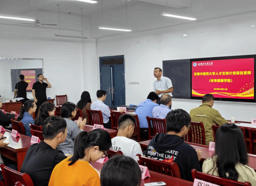 2025年10月11日,安徽中医药大学体育健康学院。在334室运康学社会议厅,举办安徽中医药大学张虎博士人才支持计划项目答辩评审会。此次答辩聘请吴生兵教授、谬成贵教授、汪黎明副教授莅临指导,并邀请全体大一新生、大二大三学生代表前来旁听学习。