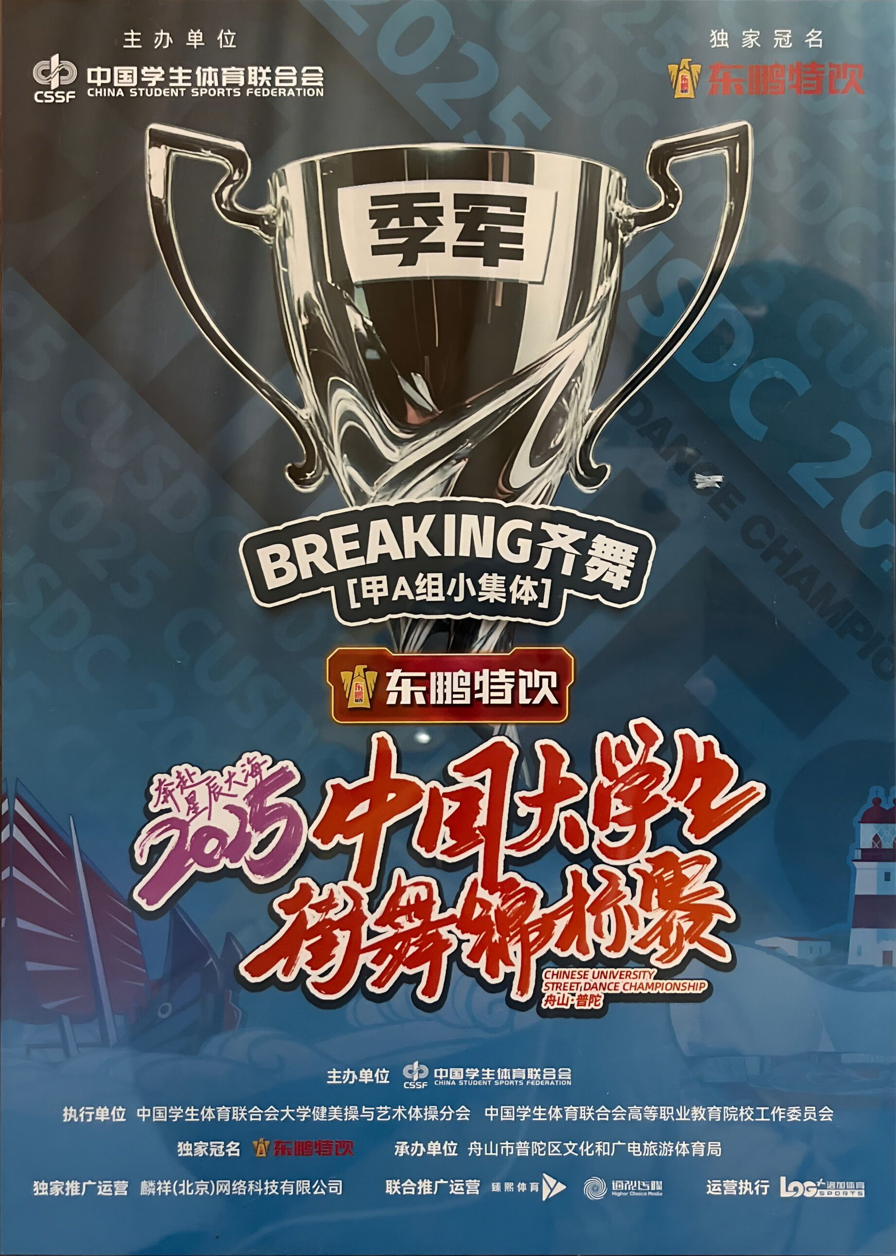 中国大学生街舞锦标赛是国内高校街舞领域的顶级赛事,设置齐舞、斗舞等多类项目,涵盖Breaking、Locking、Popping、Hip-hop等主流舞种。团队作品以刚柔并济的舞步、富有创意的编排和默契无间的配合,展现了青年一代的朝气与自信,将我校风采在全国舞台精彩绽放,赢得了评委与观众的认可。