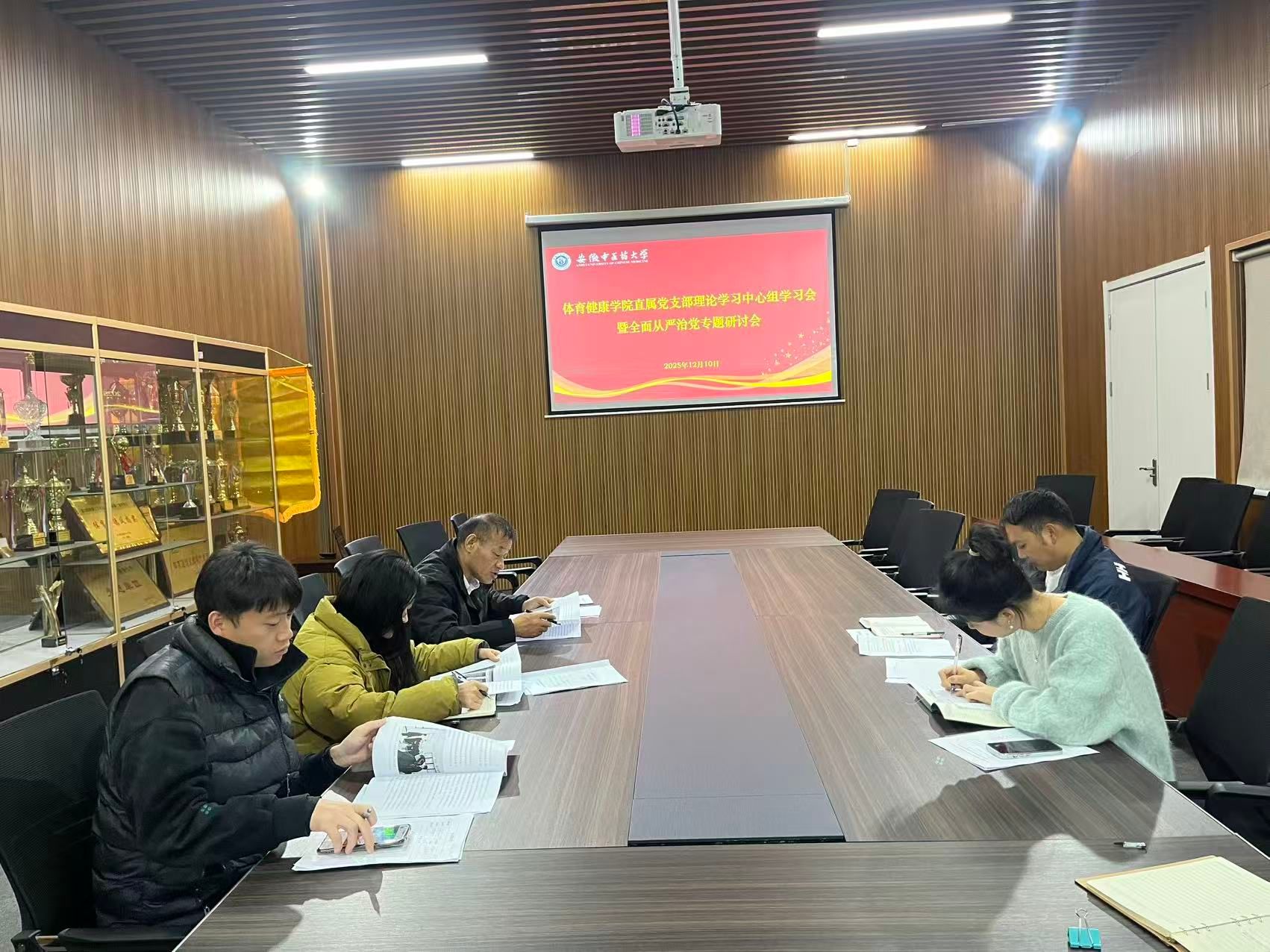 12月10日中午,学院直属党支部召开第十次理论学习中心组会议暨全面从严治党专题研讨会。会议由学院直属党支部书记吴臣军主持,刘胡同同志因公出差请假,其他支委全员参会。