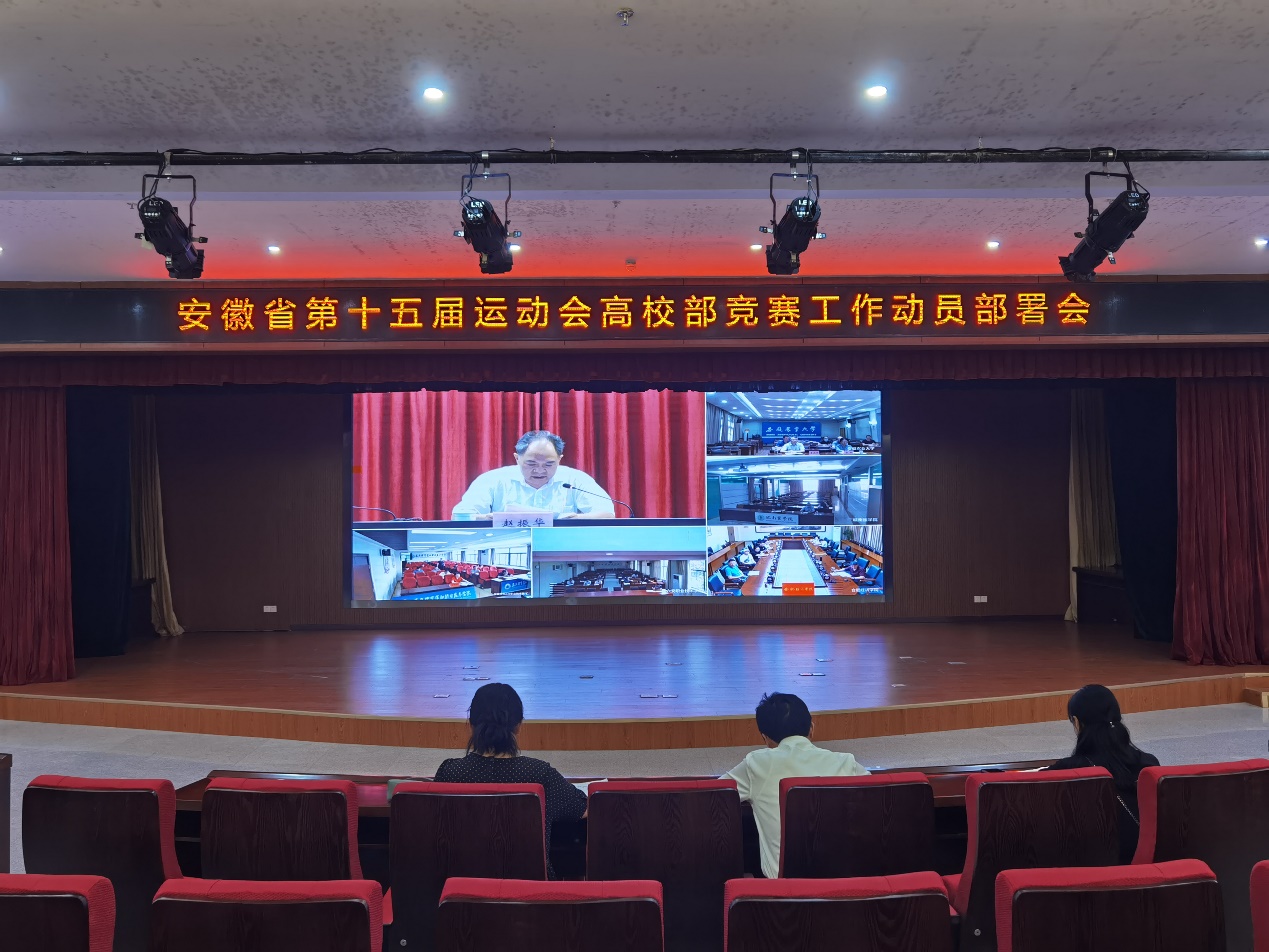 6月21上午,安徽省第十五届运动会高校部竞赛工作动员部署会视频会议召开,中共安徽省委教育工委副书记、安徽省教育厅厅长赵振华发表动员讲话,会议由中共安徽省委教育工委委员、安徽省教育厅副厅长储常连主持。我校设立分会场,学校党委副书记、校长彭代银,体育健康学院院长林红、体育健康学院直属党支部副书记兼副院长程昭参加会议。