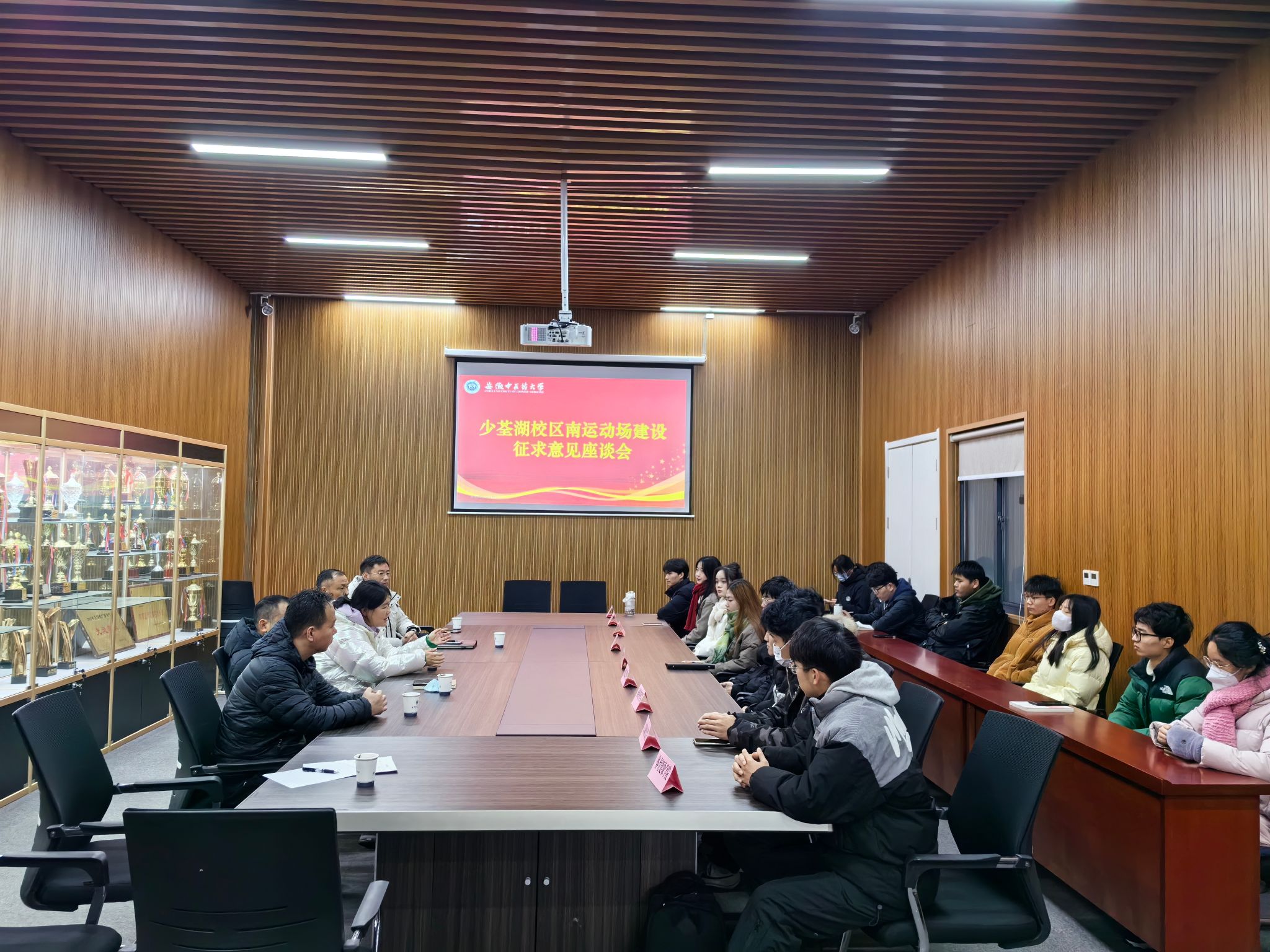 12月18日中午,体育健康学院召开全少荃湖校区南运动场建设征求意见座谈会,学校总务处副处长李国强、学生处副处长詹钟华、校团委副书记彭程、学院直属党支部书记夏宏武和各学院学生会代表同学参会,会议由学院院长林红主持。