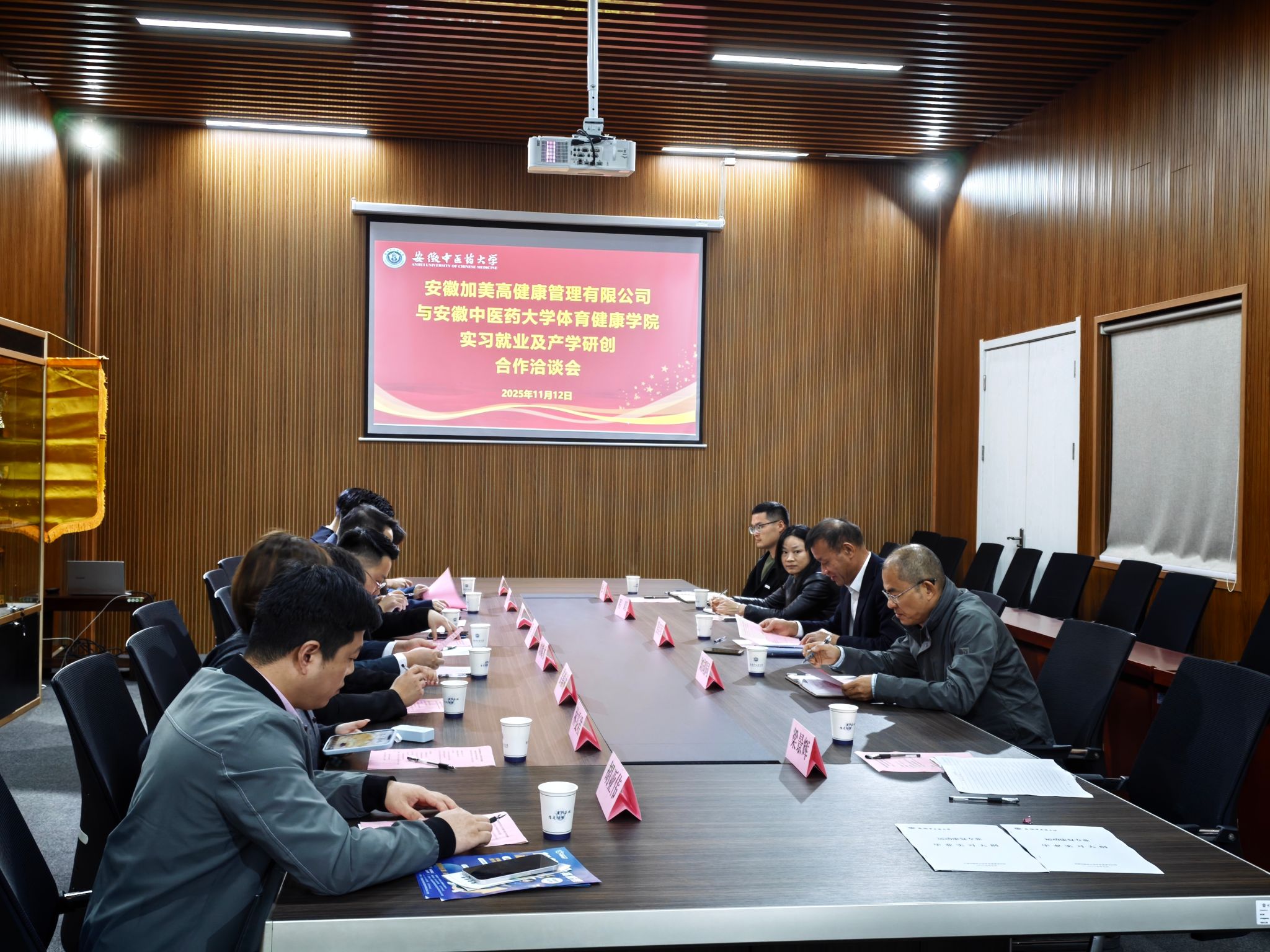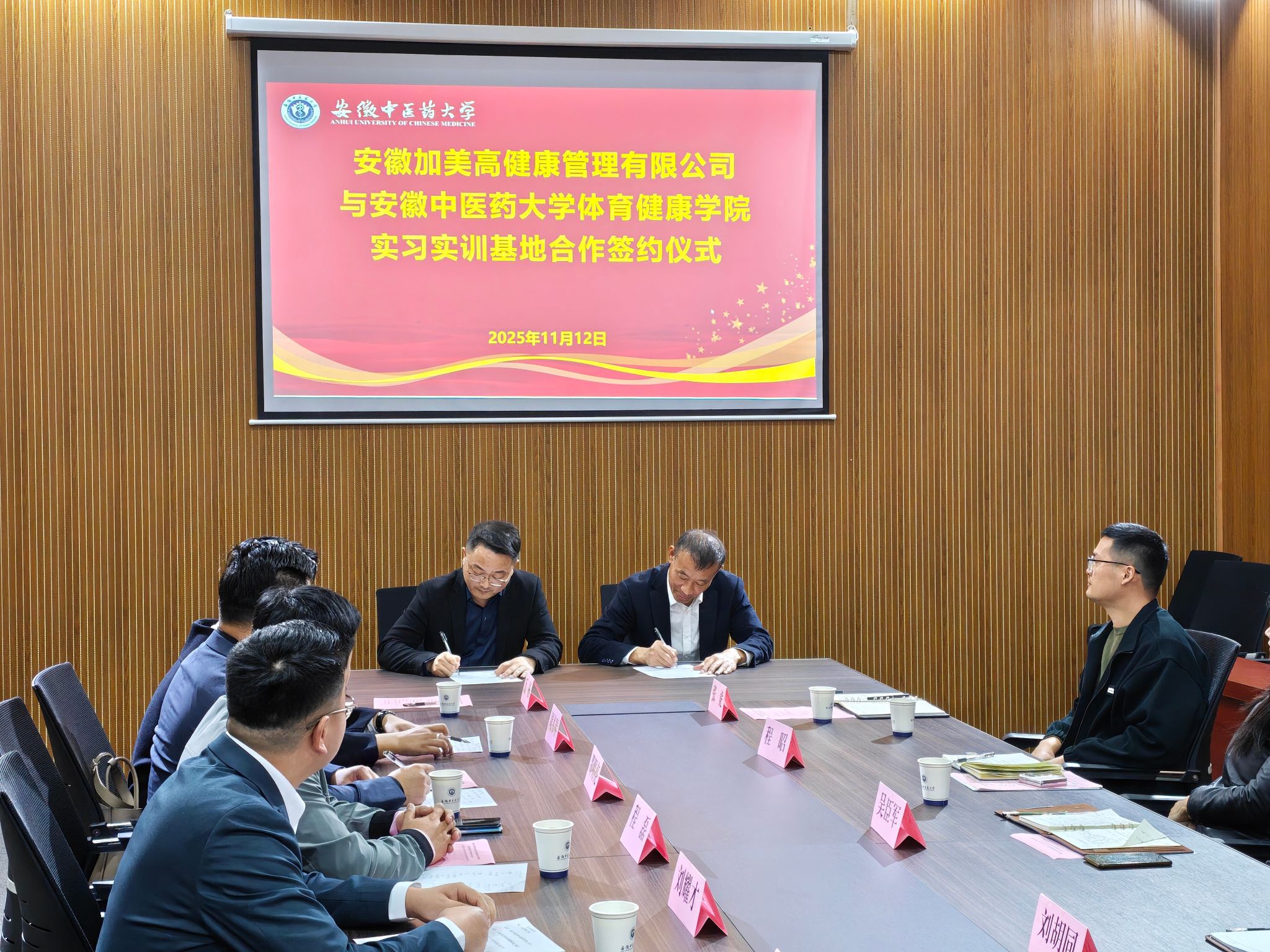 2025年11月12日,体育健康学院直属党支部书记、院长吴臣军、副书记刘胡同、副院长程昭、博士张虎,与安徽加美高健康管理有限公司总经理程磊、副总经理邵明亮、副经理刘耀才、科研数据师胡亚伟等八人在风雨操场106会议室举办实习就业及产学研创合作洽谈会,并在会后签署实习实训基地合作协议。