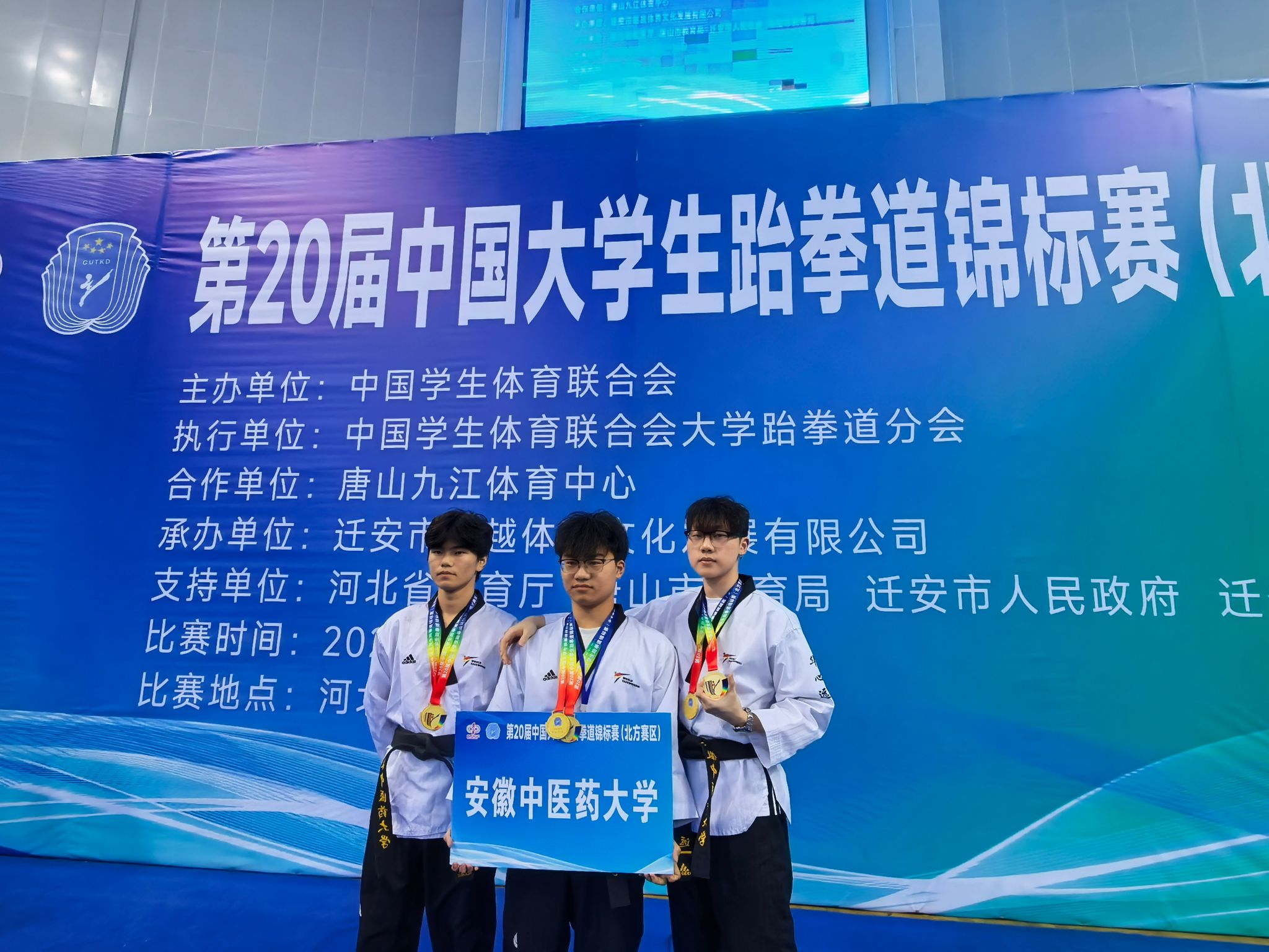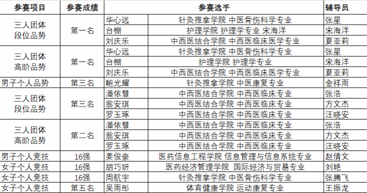 本届赛事由中国学生体育联合会主办,汇聚了全国高校品势、竞技的高水平选手。安徽中医药大学跆拳道队此次表现亮点十足:刘庆乐、台棚、华心远组成的三人团队,在甲组男子三人团体段位品势项目中摘得金牌,实现学校该项目金牌“零的突破”,另在男子甲组三人团体高阶品势中技压群芳,再夺一枚金牌!由潘依慧、翁安琪、罗玉琢组成的三人团队,在甲组女子三人团体高阶品势中收获银牌,又在女子三人团体段位赛中获得团体铜牌。两组团队均有突破,实力不俗。