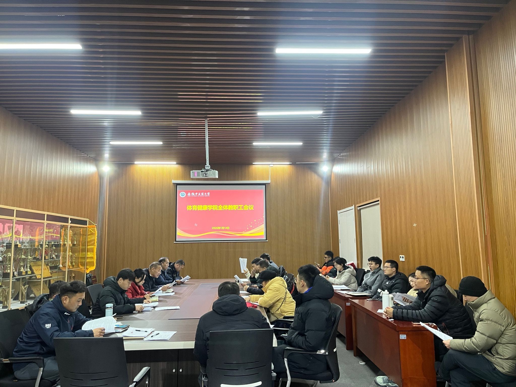 2026年1月14日上午,学院于风雨操场106会议室召开全体教职工会议,会议由学院直属党支部书记、院长吴臣军主持,全体教职工参会。