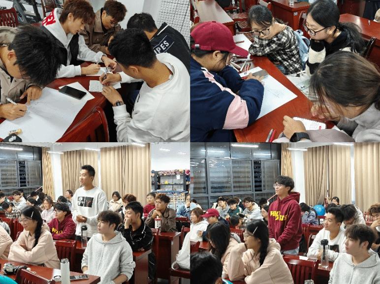 活动二:10月中旬“职业蓝图创造”环节,各小组围绕问题,结合当下的困惑开展研究讨论。同学们将之前活动中汲取的灵感与思考尽情挥洒,共同协作,在“职业规划画布”上初步勾勒出团队对未来发展的构想。讨论结束后,各小组轮番上台进行成果汇报,精彩纷呈的展示赢得了现场的阵阵掌声。