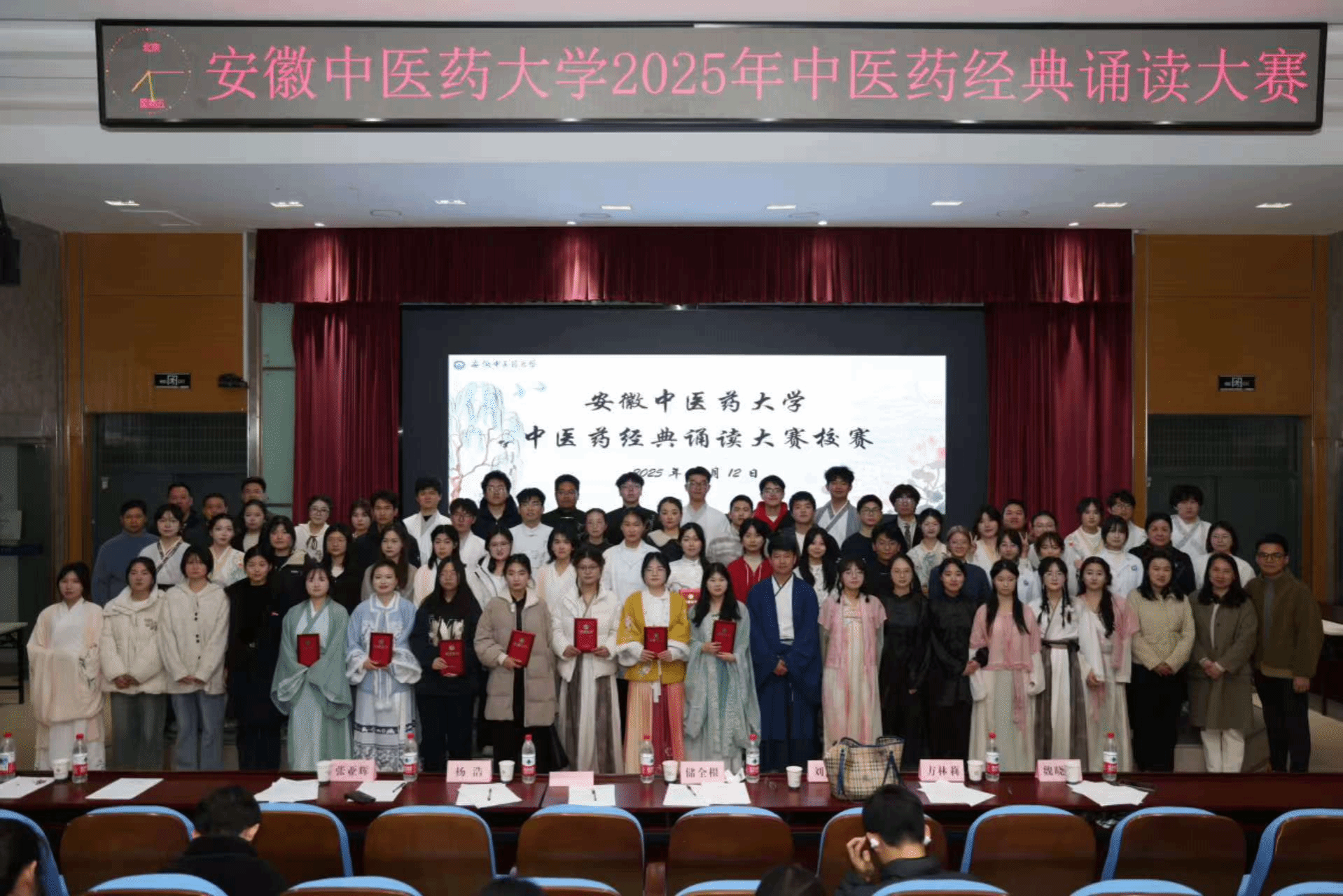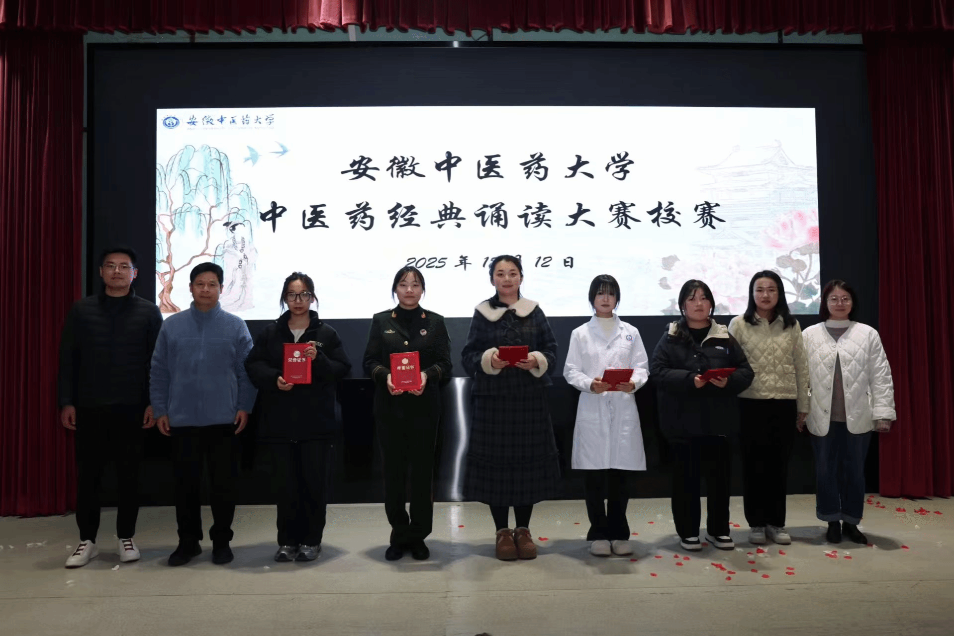 2025年12月12日,安徽中医药大学中医药经典诵读活动圆满落幕,体育健康学院大一新生团队以“一味道地药,万里富民方”为专属主题登台亮相,凭借情景化演绎、沉浸式表达与深刻内涵斩获三等奖,成为活动中的亮眼风景线,充分展现了学院新生对中医药文化的传承热忱与创新潜力。